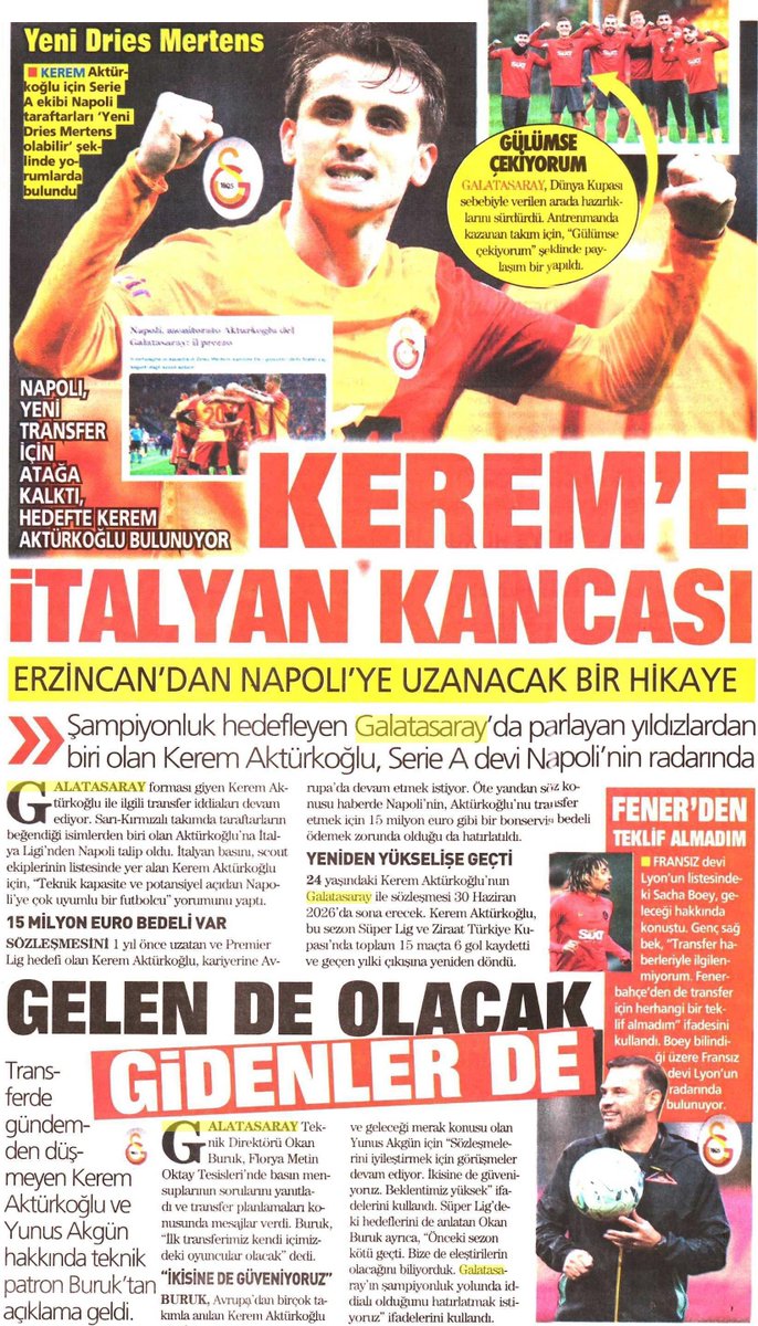 Kerem Akturkoglu seguito dagli scout del Napoli durante le ultime stagioni. La notizia diffusa da AreaNapoli.it (qui i dettagli) trova eco nei giornali turchi, che rilanciano sul talento del Galatasaray, scrivendo di lui che "potrebbe essere il nuovo Mertens". Il quotidiano Takvim dedica un'intera pagina alla vicenda, sottolineando i numeri del forte e talentuoso esterno offensivo, autore di una tripletta nell'ultima gara di Super Lig disputata prima del Mondiale (contro l'İstanbul Başakşehir, n.d.r.).