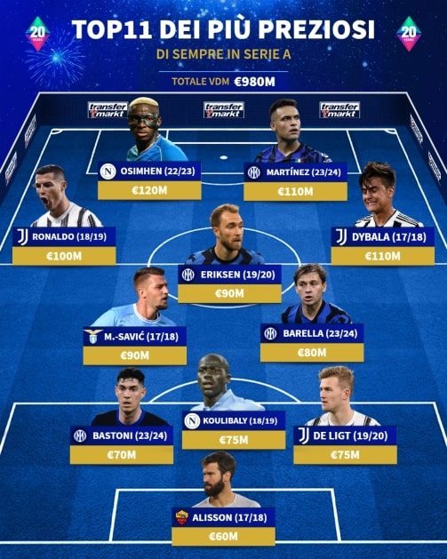 Best value Serie A: Alisson (60M); De Ligt (75M), Koulibaly (75M), Bastoni (70M); Barella (80M), Milinkovic-Savic (90M), Eriksen (90M); Cristiano Ronaldo (100M), Dybala (110M), Lautaro (110M), Osimhen (120M).