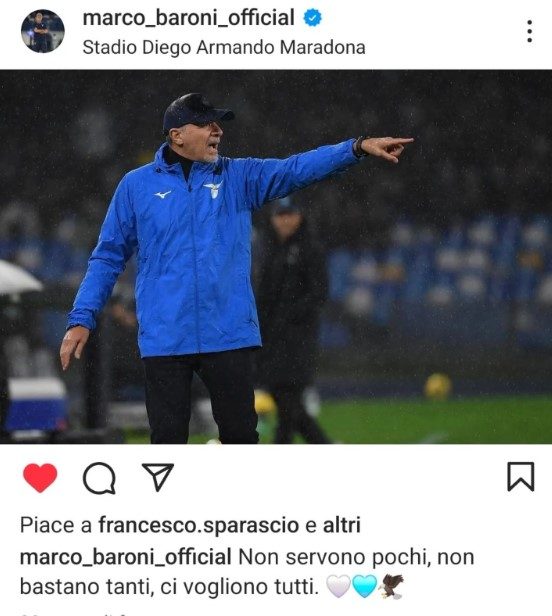 Attraverso il proprio profilo social, su Instagram, lo stesso Baroni ha pubblicato una sua fotografia che lo ritrae mentre dà indicazioni ai suoi calciatori nel corso della gara di ieri al Maradona contro i partenopei. A corredo, una didascalia: "Non servono pochi, non bastano tanti, ma ci vogliono tutti". Parole che sembrano avere unicamente l'obiettivo di far sentire tutta la rosa coinvolta nel progetto e non solo la rosa.