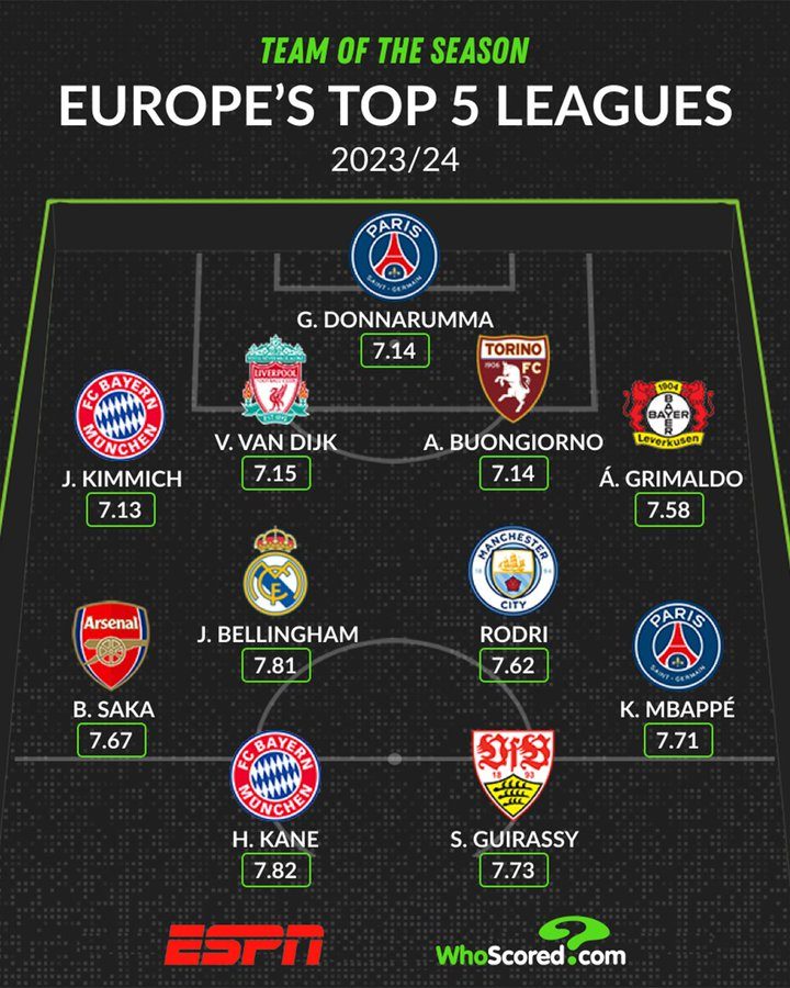 A primeggiare tra i portieri è Gianluigi Donnarumma. Nella difesa di un ipotetico 4-4-2, oltre ad Alessandro Buongiorno, troviamo Joshua Kimmich del Bayern Monaco a destra, Virgil van Dijk come secondo centrale ed Alejandro Grimaldo del Bayer Leverkusen a sinistra. A centrocampo, invece, in ordine: Bukayo Saka dell'Arsenal, Jude Bellingham del Real Madrid, Rodri del Manchester City e Kylian Mbappè del PSG, adattato al ruolo di esterno. In attacco, infine, spazio ad Harry Kane (Bayern) e Serhou Guirassy, autore di un'annata incredibile con lo Stoccarda.