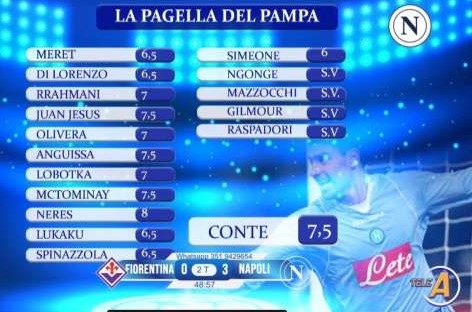 Per il Pampa Meret è da 6,5, così come il capitano Giovanni Di Lorenzo. 7 invece a Rrahmani, 7,5 a Juan Jesus e 7 ad Olivera (che a fine partita si è infortunato. Per quanto riguarda il centrocampo, 7,5 ad Anguissa, 7 allo slovacco Lobotka e 7,5 a Scott McTominay. 8 a Neres, autore di un gol sublime, 6,5 a Lukaku e Spinazzola. Senza voto invece a coloro che sono entrati, eccezion fatta per Simeone a cui Sosa dà 6. A Conte un 7,5.