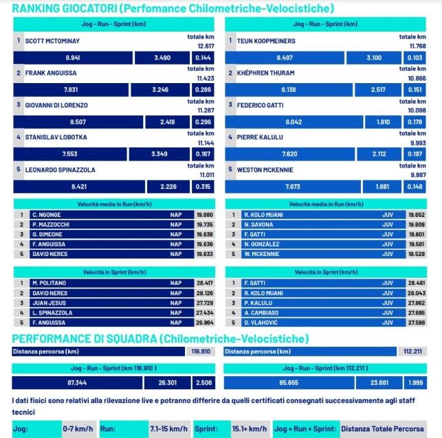 Analizzando però tutti i dati forniti dalla Lega Serie A, viene fuori un altro aspetto determinante della gestione di Antonio Conte: a coprire distanze maggiori sono quasi sempre i terzini e i tre centrocampisti, ovvero Lobotka, Anguissa e, appunto, McTominay, oltre al capitano Di Lorenzo e a Spinazzola. Di seguito la tabella completa. Per la Juventus il mediano Koopmeiners è primo con 11,768 km.