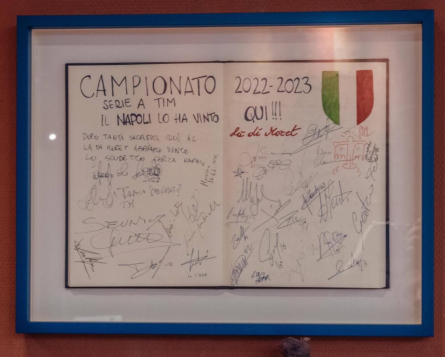 Capitan Giovanni Di Lorenzo e compagni hanno trovato una bella sorpresa: nella hall dell'albergo, infatti, è stato esposto un quadro con le firme di tutti i giocatori del Napoli che hanno vinto il titolo con Luciano Spalletti in panchina: sicuramente un bel modo per dare loro il benvenuto e ricordare la grande impresa portata a termine dominando il campionato 2022/2023, quando ogni avversario viveva con grande timore le partite contro Victor Osimhen, Kvicha Kvaratskhelia e gli altri calciatori partenopei.