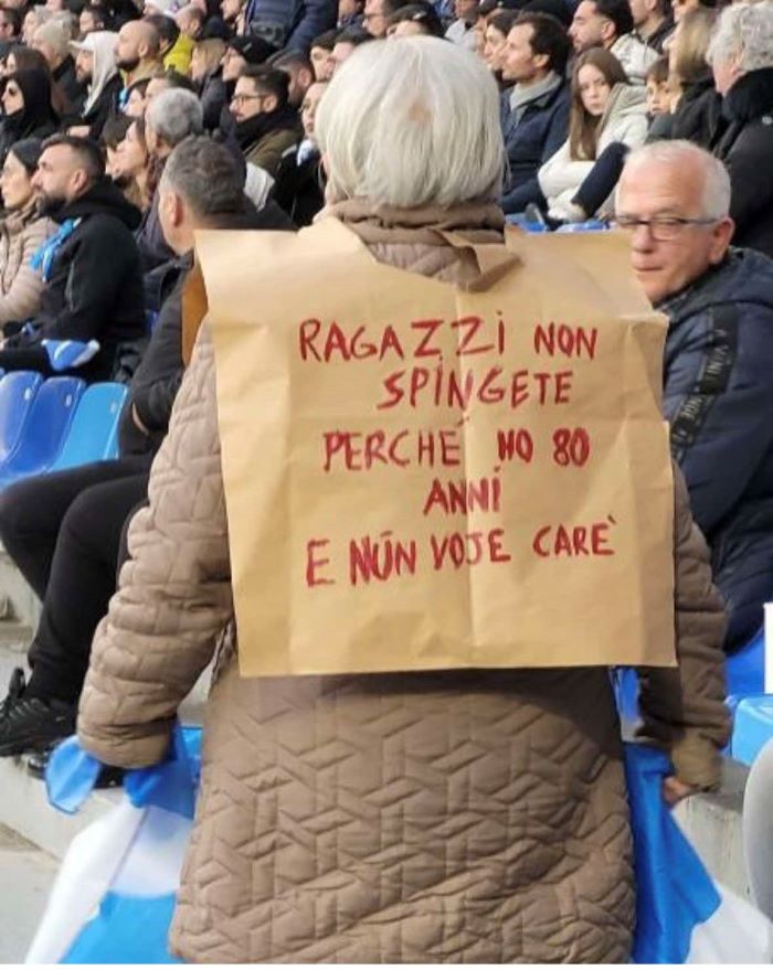 Non è stato solo il match Napoli-Venezia a rubare la scena, ma anche un episodio curioso sugli spalti dello stadio di Fuorigrotta. Una simpatica tifosa azzurra, infatti, ha catturato l'attenzione dei presenti indossando un sacchetto con la scritta: "Ragazzi non spingete, perché ho 80 anni e nun voje carè. Forza Napoli!!!". Questo siparietto ha strappato sorrisi e suscitato affetto tra i tifosi, che non hanno mancato di immortalare il momento con foto insieme all’anziana e spiritosa sostenitrice.
