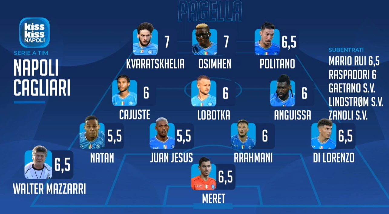 "Bene Meret (6.5), non mi è piaciuto Natan (5.5). Non cambio idea sul calciatore, mi piace, apprezzo il suo acquisto, ma contro il Cagliari non ha spinto come aveva fatto invece con il Braga. Insufficiente anche Juan Jesus (5.5). I centrocampisti invece sono da sei. Non hanno fatto male, ma da Anguissa, Cajuste e Lobotka, in certe partite, mi aspetto di più. Avrebbero dovuto e potuto incidere maggiormente. Sette a Osimhen e Kvara, i protagonisti della partita. 6.5 infine a Mazzarri. Gli tolgo mezzo punto perché Raspadori e Mario Rui sarebbero dovuti entrare una decina di minuti prima. Ma si tratta di piccole cose, dico bravo al mister", le parole di Del Genio.