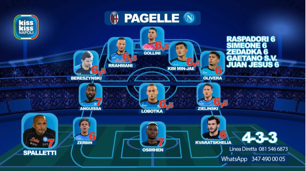 "Per quello che concerne il centrocampo, Anguissa (sette) sta facendo molto bene: è tornato a ottimi livelli. Bene anche Piotr Zielinski (6.5) e il solito Stanislav Lobotka (6.5). Non mi è piaciuto più di tanto Zerbin (sei). Meglio Zedadka (6): gli do lo stesso voto di Zerbin, ma ha fatto vedere qualcosa di più. Sette a Victor Osimhen, autore di una doppietta", ha aggiunto il cronista partenopeo Paolo Del Genio nel corso del suo intervento in radio.