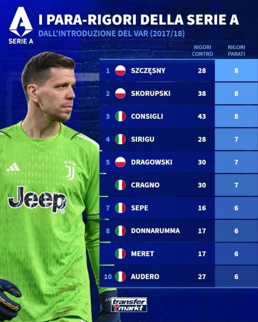 Numeri alla mano, al primo posto di questa speciale graduatoria spicca l'Udinese, con 21 rigori contro (come la Salernitana) e 19 gol subiti (17 per i granata); poi c'è la Fiorentina, con 19 rigori a sfavore e 15 nello specchio; più in là troviamo Milan e Torino, settimi con 14 penalty; decima la Juventus, a quota 11 conclusioni dal dischetto contro i propri portieri; dodicesima la Roma, con 10; tredicesima l'Inter, con 9; quattordicesimo il Napoli, con 8 rigori contro e 4 gol subiti.
