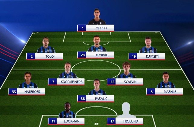 ATALANTA (3-4-1-2): Musso; Toloi, Demiral, Djimsiti; Hateboer, Scalvini, Koopmeiners, Maehle (Soppy); Pasalic; Lookman, Hojlund (Zapata). All. Gasperini