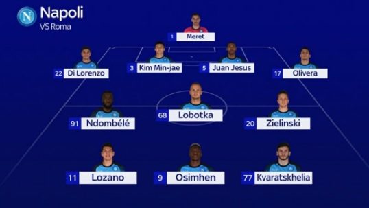Per quello che concerne il Napoli, Alex Meret partirà dal primo minuto. Davanti all'estremo difensore friulano agiranno Kim e Juan Jesus al centro, Giovanni Di Lorenzo e Mathias Olivera (sostituirà Mario Rui) occuperanno invece rispettivamente la fascia destra e quella sinistra. In mezzo al campo ancora fiducia a Ndombele, Lobotka e Piotr Zielinski. Confermatissimo in attacco a sinistra Kvaratskhelia, accanto a lui agiranno Victor Osimhen (in panchina Raspadori) al centro e Politano a destra. In basso il grafico.