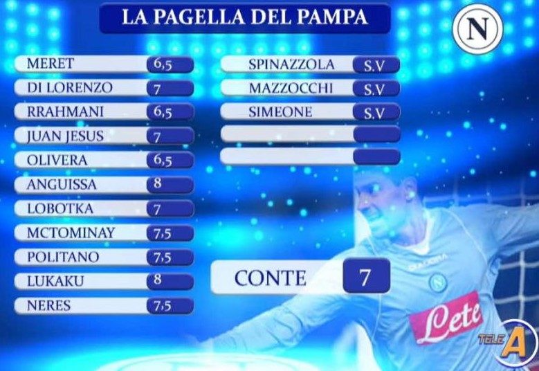 Questi gli altri voti al resto della squadra: "A Meret 6,5, al capitano Giovanni Di Lorenzo e a Juan Jesus 7 pieno, mentre ad Amir Rrahmani ed Olivera 6,5. 8 ad Anguissa, autore del cross per la testa di Lukaku, 7 a Lobotka, 7,5 a McTominay. Agli esterni Politano e Neres 7,5, mentre al tecnico Antonio Conte voto 7. Senza voto invece coloro che sono entrati, ovvero Spinazzola, Mazzocchi e Simeone".