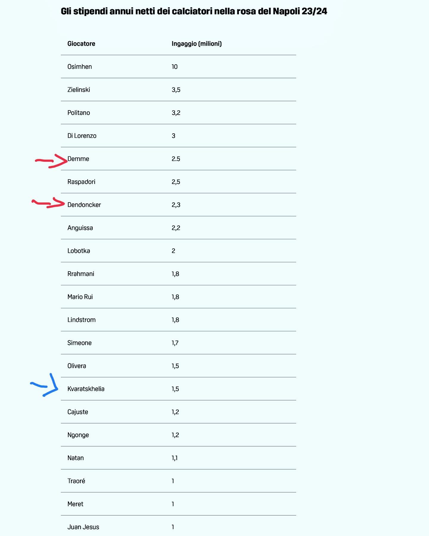A seguire, il monte ingaggi della SSC Napoli pubblicato da Perillo, tra l'altro conduttore di 'Note Azzurrissime', trasmissione di RAI - Radio Live Napoli che racconta il club azzurro, tra parole e musica, ogni martedì alle 18:30: