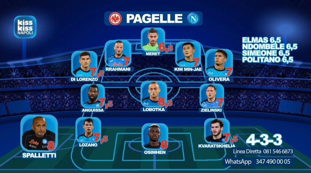 Il Napoli ha superato l'Eintracht Francoforte con il punteggio di 0-2. Il giornalista Paolo Del Genio ha assegnato i suoi voti ai calciatori azzurri: "6.5 ad Alex Meret anche se non è stato mai impensierito davvero dai tedeschi. Bene la difesa con Giovanni Di Lorenzo (7.5), autore di una prestazione molto importante. 7 per Kim, Rrahmani e Olivera. A centrocampo domina Stanislav Lobotka (8.5 per lo slovacco, il migliore in campo). Bene anche Anguissa (7.5) e Zielinski (7)".