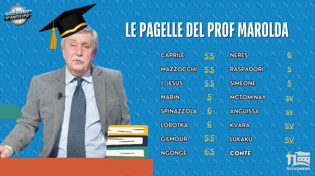 "Scott McTominay senza voto perché ha giudicato pochi minuti nonostante il gol e la traversa colpita. A Rafa Marin metto 5, ma avrebbe meritato un 4.5 in pagella. Leggermente meglio di lui Raspadori e Simeone, a entrambi cinque. 5.5 infine a Caprile, Mazzocchi, Juan Jesus, Gilmour", ha aggiunto Francesco Marolda.