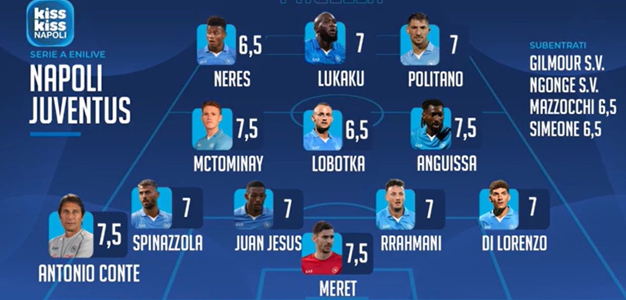 "7.5 ad Alex Meret, ancora una volta decisivo. Devo dire che Juan Jesus (7) e Spinazzola (7) mi hanno stupito. Sono onesto, non credevo che potessero tornare a certi livelli. Parliamo di due calciatori dal passato importante e stanno facendo molto bene in questa stagione. Solita prestazione straordinaria di Anguissa (7.5). Stesso voto per McTominay e mister Antonio Conte. Sette invece a Lukaku e Politano", le parole di Paolo Del Genio.