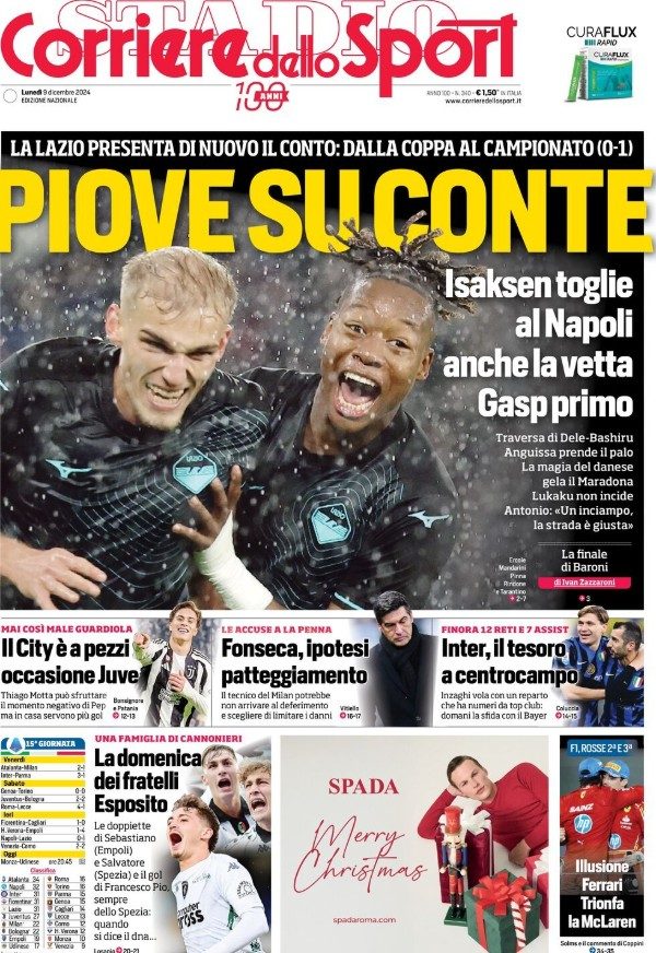 "Piove su Conte", si legge sul quotidiano capitolino, che nella sua edizione romana esalta invece la Lazio: "Piovono sogni", scrive a proposito dei biancocelesti. La versione nazionale come quella locale elogia il gol di Isaksen: "Toglie al Napoli anche la vetta, Gasp primo". Troppo poco quanto fatto dagli azzurri in fase realizzativa: "Anguissa prende il palo, la magia del danese gela il Maradona. Lukaku non incide e Conte parla di 'inciampo'...".