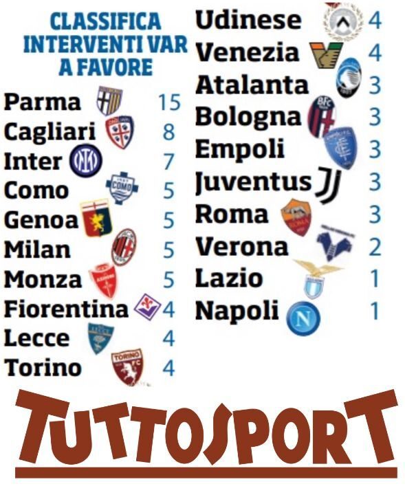 A stilare la graduatoria è la redazione di Tuttosport, che la propone sull'edizione odierna del quotidiano piemontese. Il tutto, quando manca poco allo scontro diretto tra lo stesso Napoli e l'Inter, previsto per sabato pomeriggio al 'Maradona'. Sul podio, ma in terza posizione, troviamo proprio l'Inter di Inzaghi (7 interventi a favore), dietro Cagliari (8) e Parma, che guida questa speciale classifica (ben 15 le chiamate a vantaggio del ducali, n.d.r.).