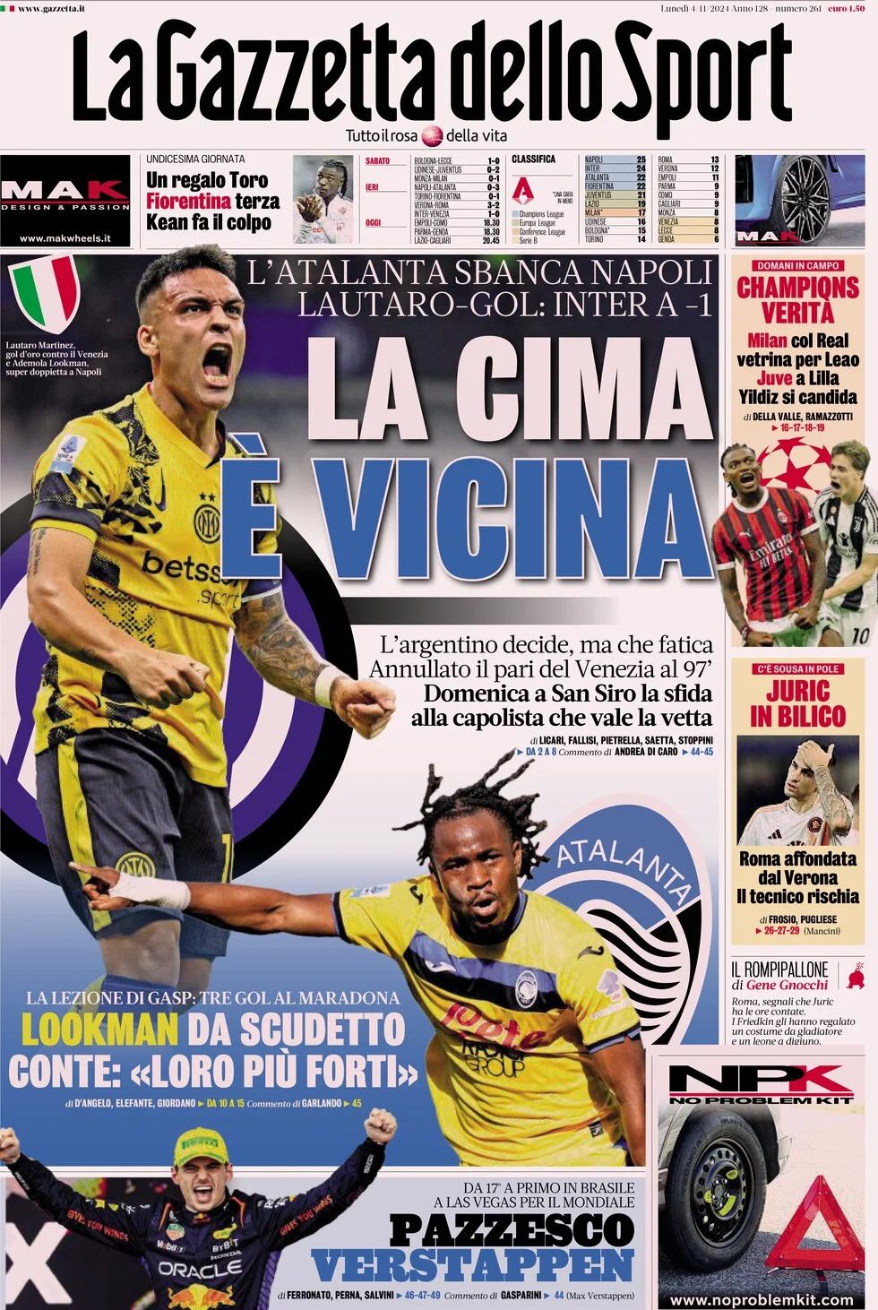 La Gazzetta dello Sport oggi in edicola dedica ampio spazio alla vittoria dell'Inter sul Venezia e la corsa Scudetto, con i nerazzurri che affronteranno il Napoli capolista (reduce dalla sconfitta con l'Atalanta, n.d.r.) nella prossima giornata del campionato di Serie A.