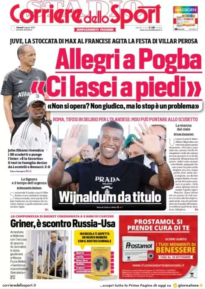 PRIMA PAGINA CORRIERE - Allegri a Pogba: "Ci lasci a piedi"