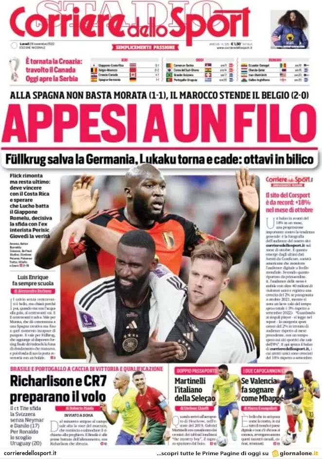 Sono tanti gli spunti che arrivano dalla prima pagina del Corriere dello Sport. Il noto quotidiano si sofferma su alcuni degli argomenti più caldi del momento. Ecco alcuni titoli dell'ultima edizione: "Appesi a un filo. Fullkrug salva la Germania, Lukaku torna e cade: ottavi in bilico".