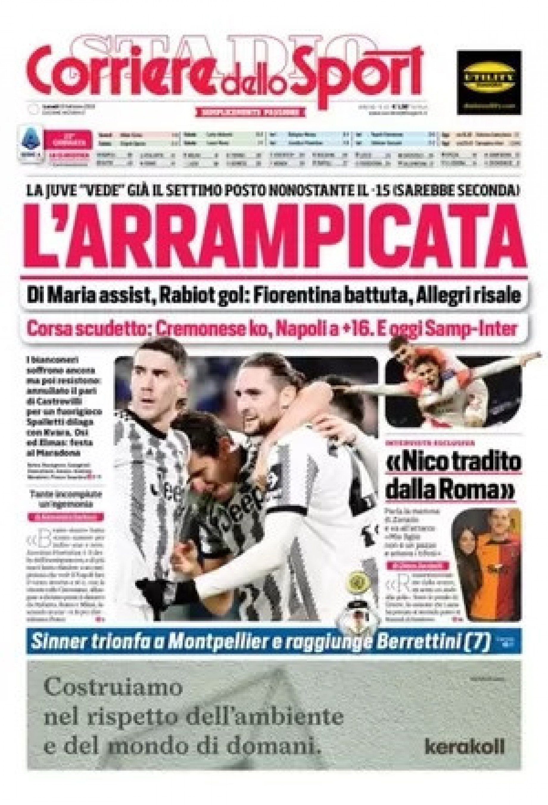 Sono tanti gli spunti che arrivano dalla prima pagina del Corriere dello Sport. Il noto quotidiano si sofferma su alcuni degli argomenti più caldi del momento. Ecco alcuni titoli dell'ultima edizione: "L'arrampicata: la Juve vede già il settimo posto nonostante il -15 (sarebbe seconda)". E ancora: "Corsa Scudetto: Cremonese KO, il Napoli à+16. E oggi Samp-Inter".
