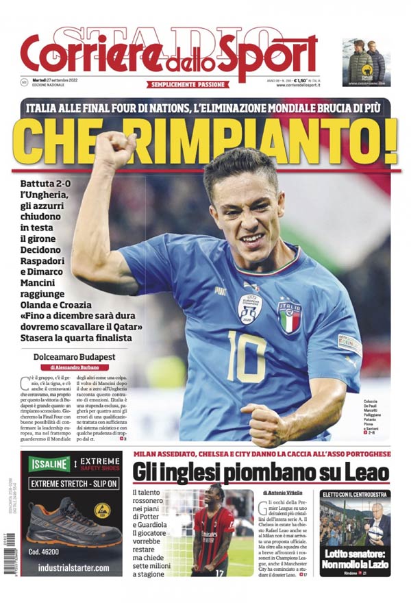 L'apertura dell'edizione odierna del Corriere dello Sport batte il chiodo sulla mancata qualificazione al Mondiale (la seconda di fila per l'Italia), soprattutto dopo le due belle vittorie in Nations contro Inghilterra e Ungheria: "Che rimpianto!". In taglio basso, uno spazio di mercato legato a Rafael Leao.