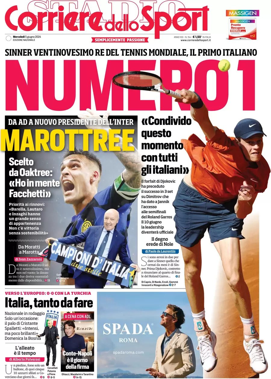 Sono tanti gli spunti che arrivano dalla prima pagina del Corriere dello Sport. Il noto quotidiano si sofferma su alcuni degli argomenti più caldi del momento. Ecco alcuni titoli dell'ultima edizione: "Numero1, Sinner ventinovesimo re del tennis mondiale: è il primo italiano". E ancora: "A cena con ADL. Conte-Napoli, è il giorno della firma" si legge sul giornale.