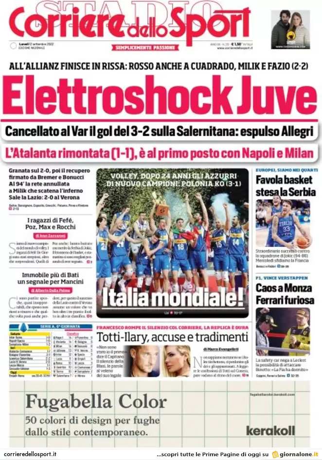 Sono tanti gli spunti che arrivano dalla prima pagina del Corriere dello Sport. Il noto quotidiano si sofferma su alcuni degli argomenti più caldi del momento. Ecco alcuni titoli dell'ultima edizione: "Elettroshock Juve, cancellato al VAR il gol del 3-2 sulla Salernitana. Atalanta rimontata, è al primo posto con Napoli e Milan".