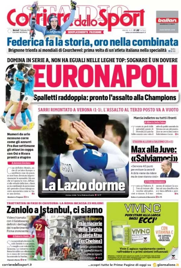 "EuroNapoli", titola l'edizione odierna del Corriere dello Sport in prima pagina. "Spalletti raddoppia: pronto l'assalto alla Champions. Sognare è un dovere", riferisce il quotidiano.