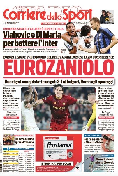 PRIMA PAGINA CORRIERE - EuroZaniolo. Juve, Vlahovic e Di Maria per battere l'Inter