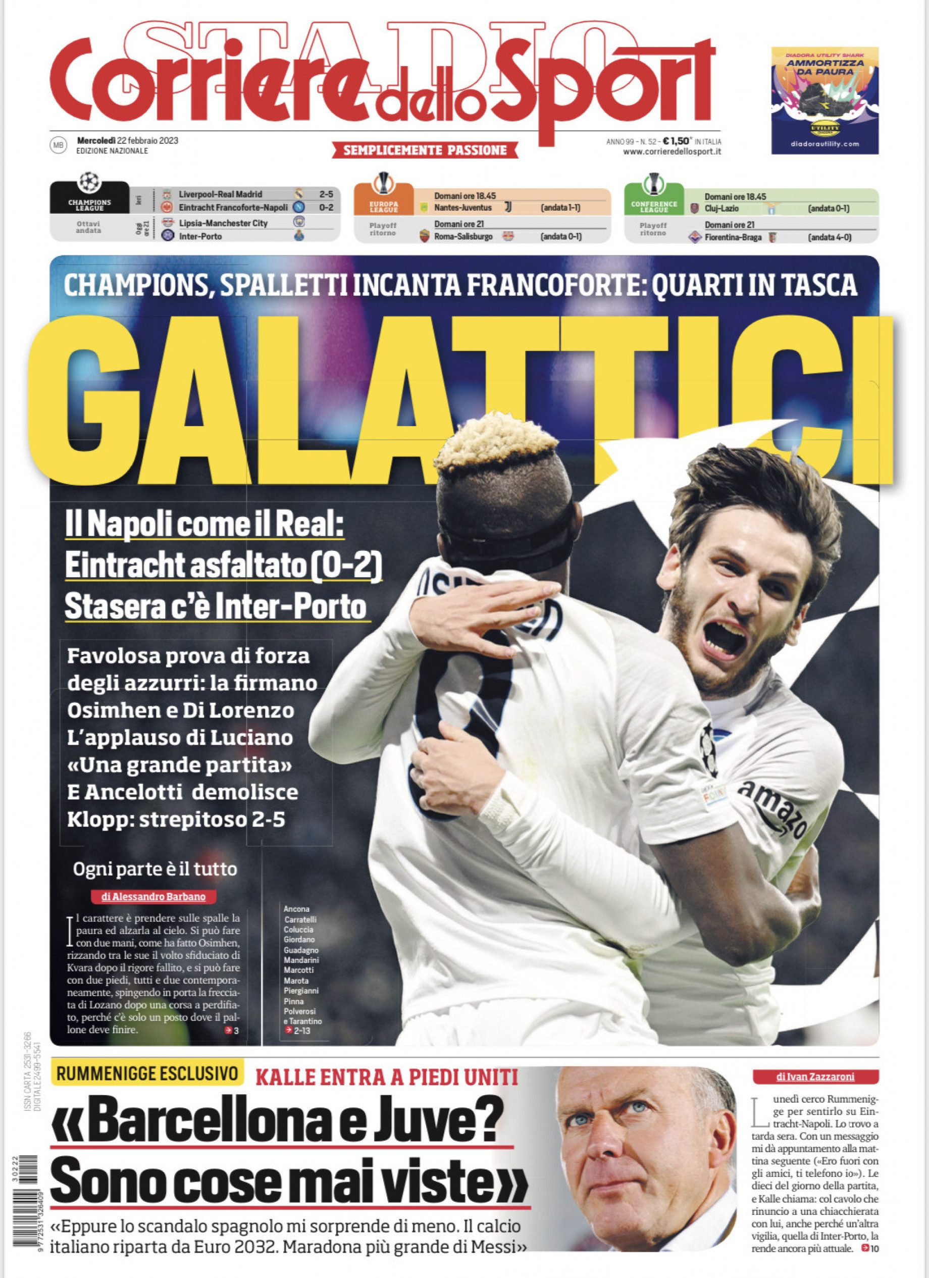 Sono tanti gli spunti che arrivano dalla prima pagina del Corriere dello Sport. Il noto quotidiano si sofferma su alcuni degli argomenti più caldi del momento. Ecco alcuni titoli dell'ultima edizione: "Galattici. Il Napoli come il Real: Eintracht asfaltato. Spalletti incanta a Francoforte: Quarti in tasca".