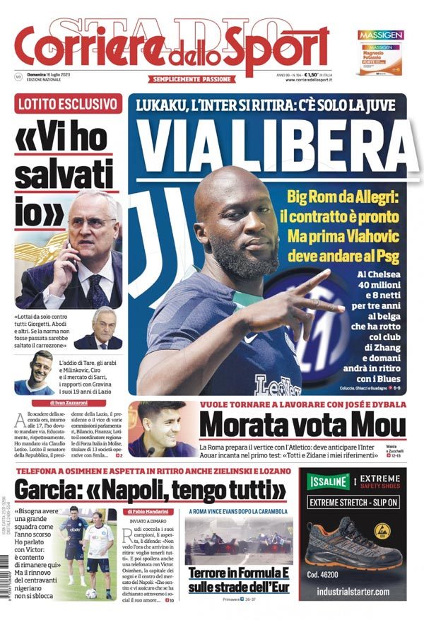 La prima pagina del Corriere dello Sport titola sulla situazione Romelu Lukaku, con l'Inter che ha chiuso la trattativa con il Chelsea. Spazio anche a all'intervista in esclusiva al presidente della Lazio Claudio Lotito. Nel taglio basso le parole di Garcia in conferenza stampa sul mercato del Napoli e, per concludere, due trafiletti: uno sulla punta che Mourinho vorrebbe alla Roma e uno sull'incidente in Formula E.
