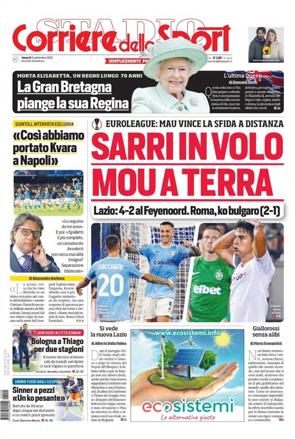 L'edizione odierna del Corriere dello Sport riserva l'apertura alla bella vittoria della Lazio in Europa League e alla sconfitta della Roma: "Sarri in volo, Mou a terra". In colonna a sinistra spazio all'intervista esclusiva a Giuntoli: "Così abbiamo portato Kvara a Napoli", mentre in basso spazio al nuovo allenatore del Bologna: "Bologna a Thiago per due stagioni". In alto uno spazio riservato alla morte della Regina Elisabetta.