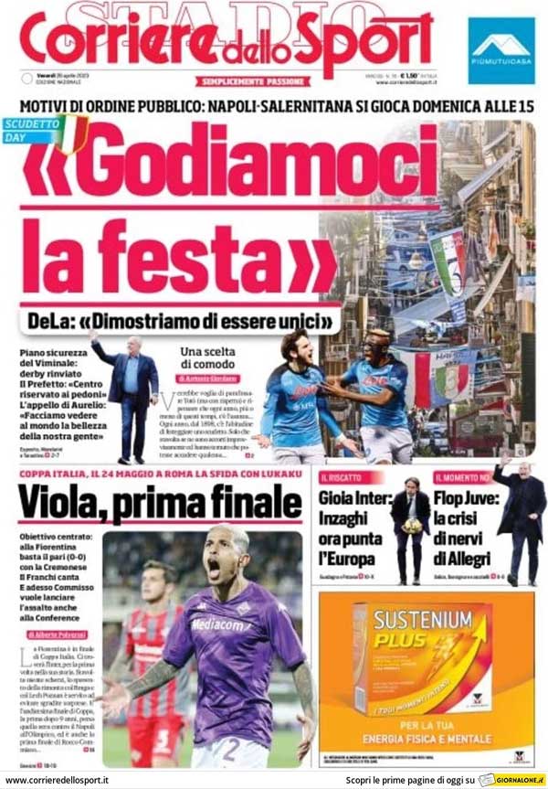 "Godiamoci la festa", titola l'edizione odierna del Corriere dello Sport in merito alle dichiarazioni di Aurelio De Laurentiis. Il presidente sottolinea: "Dimostriamo di essere unici".