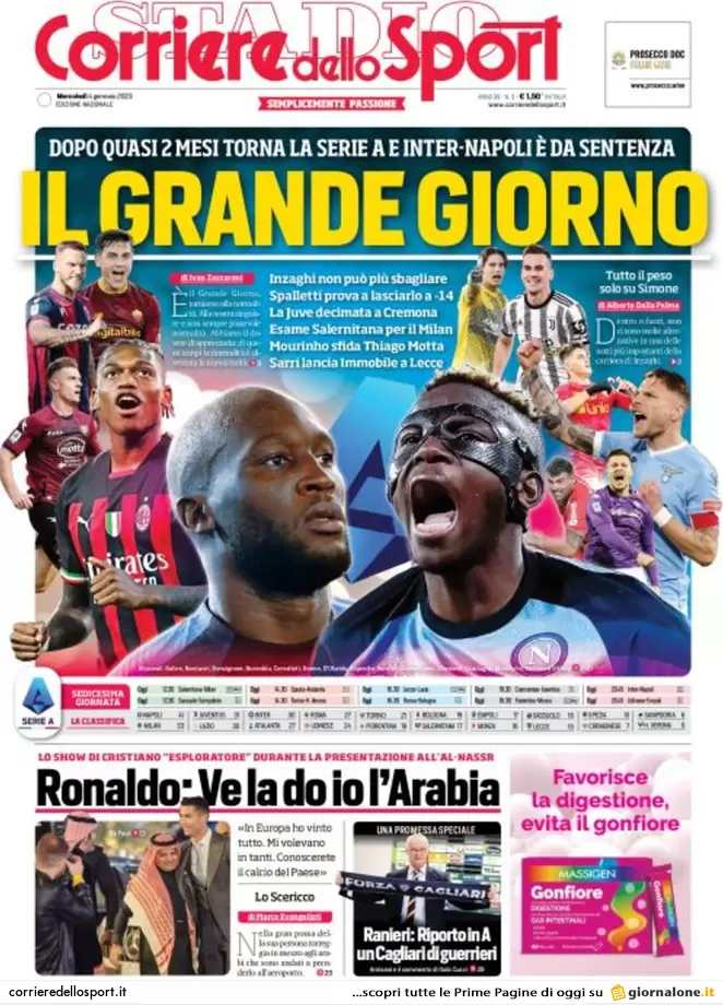PRIMA PAGINA CORRIERE - Il grande giorno. Col Napoli Inzaghi non può sbagliare