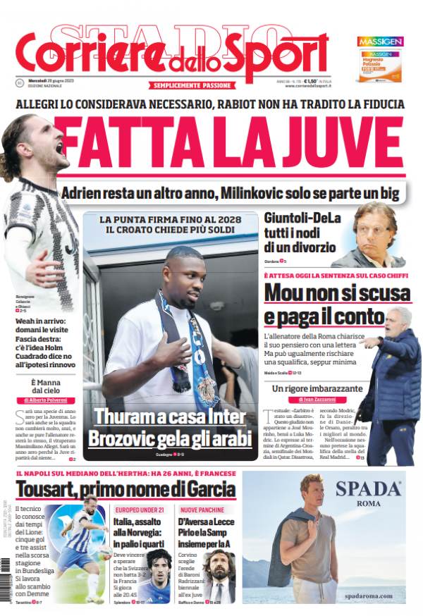 La prima pagina del noto quotidiano si sofferma sui temi più caldi del momento relativi al calcio italiano e non solo.