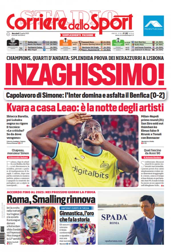 "Inzaghissimo" è il titolo scelto dal Corriere dello Sport per la prima pagina dell'edizione odierna. Spazio anche per la partita tra Napoli e Milan, valida per l'andata dei quarti di finale di Champiosn League.