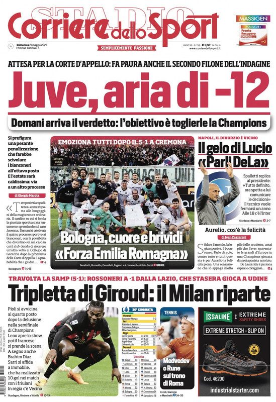 La prima pagina del Corriere dello Sport dedica spazio al futuro della Juventus e alla possibile nuova penalizzazione. Spazio anche alle parole di Spalletti e alle vittorie di Milan e Bologna.
