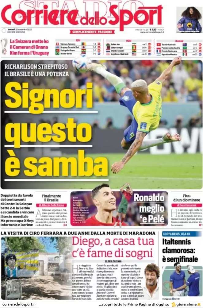 Sono tanti gli spunti che arrivano dalla prima pagina del Corriere dello Sport. Il noto quotidiano si sofferma su alcuni degli argomenti più caldi del momento. Ecco alcuni titoli dell'ultima edizione: "Signori, questo è samba: Richarlison strepitoso, il Brasile è una potenza. Kim ferma l'Uruguay. Ronaldo meglio 'e Pelè. Ferrara: Diego, a casa tua c'è fame di sogni".
