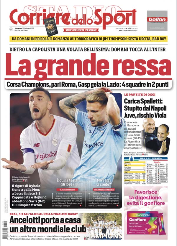 "La grande ressa", titola così il Corriere dello Sport in riferimento al pareggio della Roma e alla sconfitta della Lazio in chiave quarto posto. Spazio anche alle gare della domenica: "Carica Spalletti: Stupito dal Napoli. Juve, rischio Viola". In taglio basso c'è il Real Madrid: "Ancelotti porta a casa un altro mondiale club".
