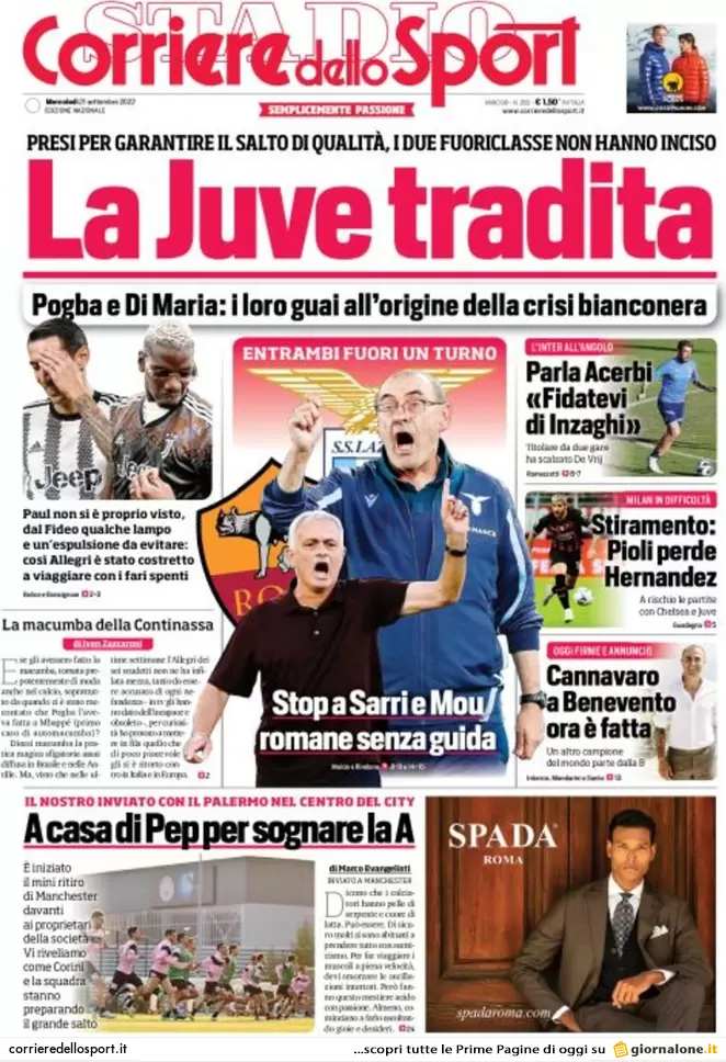 PRIMA PAGINA CORRIERE - La Juve tradita. Pogba e Di Maria: i loro guai all'origine della crisi