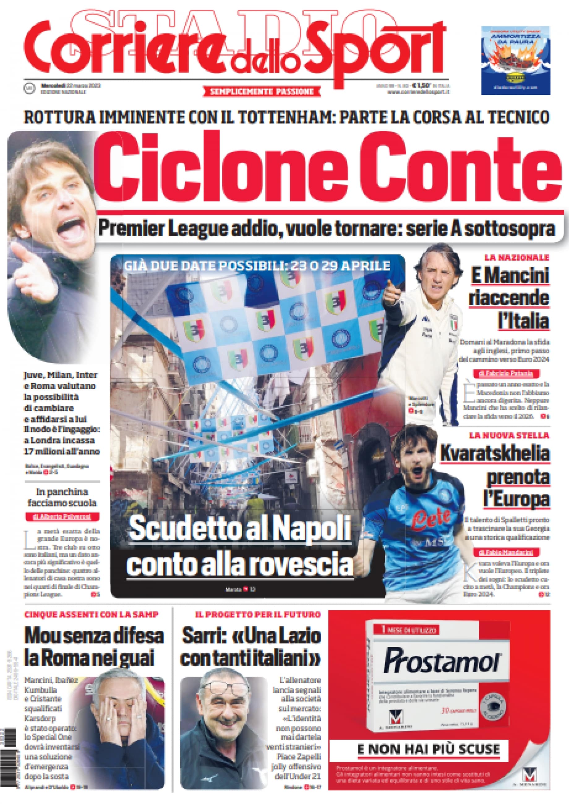 Sono tanti gli spunti che arrivano dalla prima pagina del Corriere dello Sport. Il noto quotidiano si sofferma su alcuni degli argomenti più caldi del momento. Ecco alcuni titoli dell'ultima edizione: "Scudetto Napoli, conto alla rovescia. La nuova stella: Kvaratskhelia prenota l'Europa".