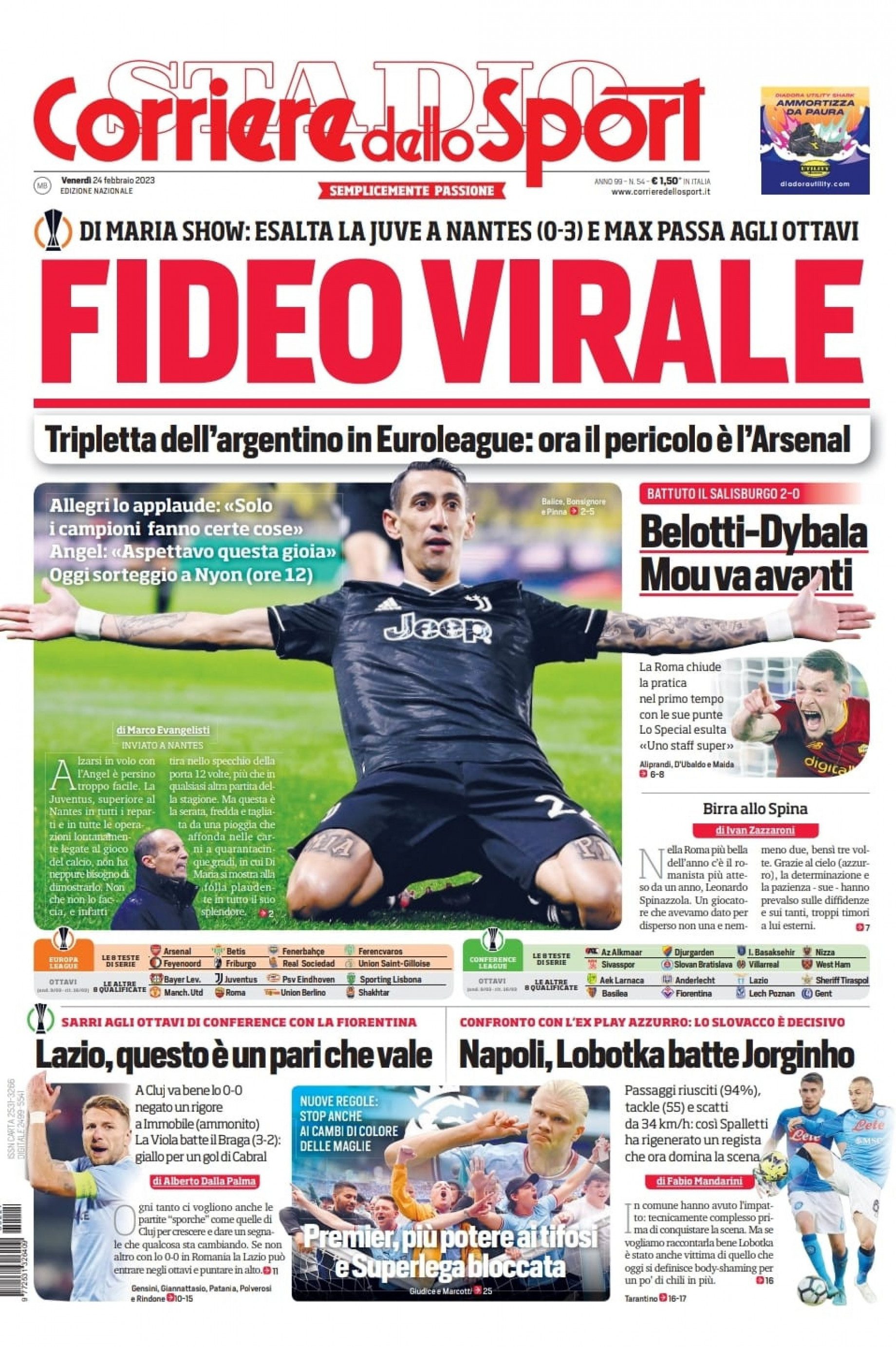 Sono tanti gli spunti che arrivano dalla prima pagina del Corriere dello Sport. Il noto quotidiano si sofferma su alcuni degli argomenti più caldi del momento. Ecco alcuni titoli dell'ultima edizione: "Fideo virale: tripletta dell'argentino in Euroleague: ora il pericolo è l'Arsenal". E ancora: "Napoli, Lobotka batte Jorginho. Confronto con l'ex play azzurro".