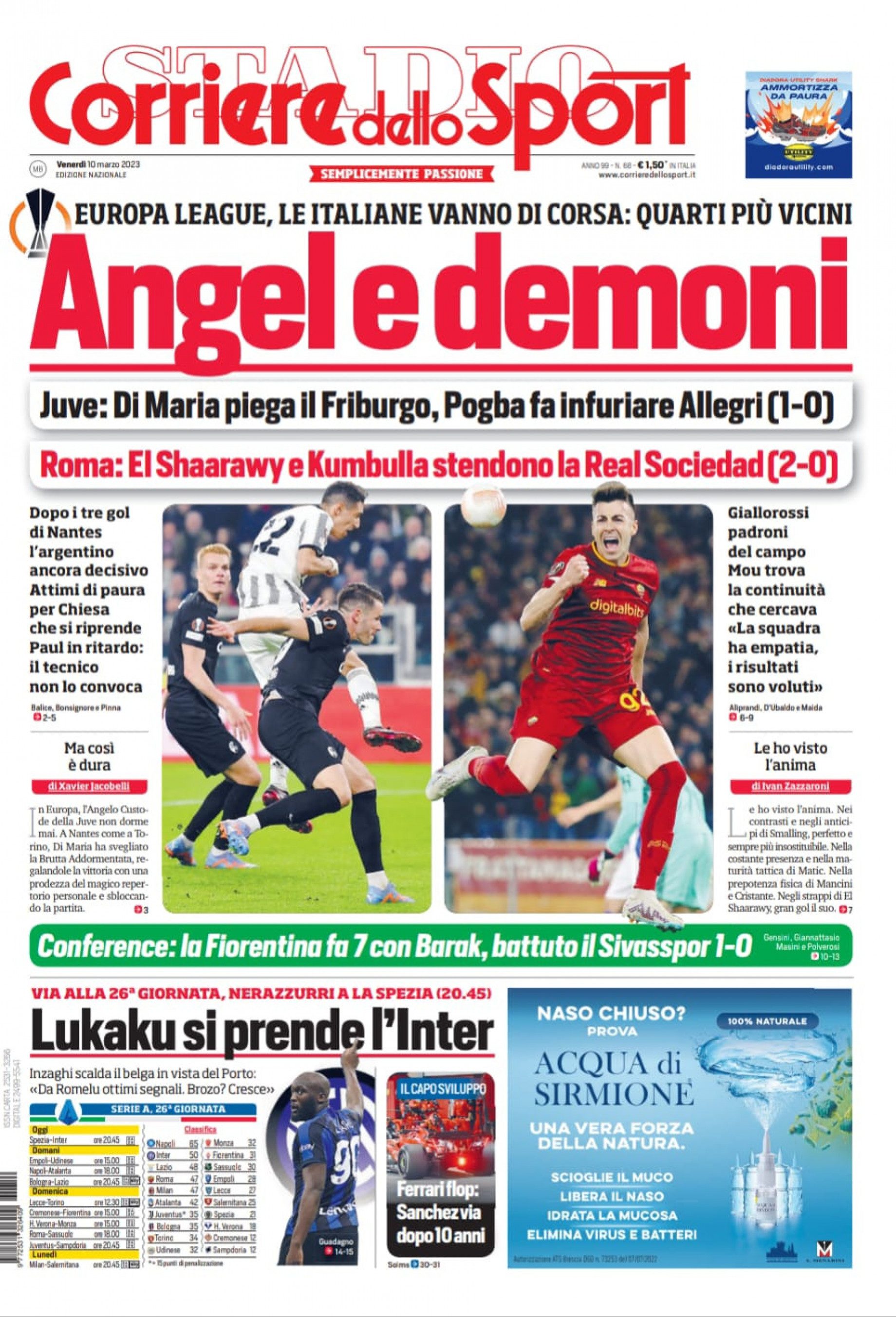 Sono tanti gli spunti che arrivano dalla prima pagina del Corriere dello Sport. Il noto quotidiano si sofferma su alcuni degli argomenti più caldi del momento. Ecco alcuni titoli dell'ultima edizione: "Angel e demoni. Juve: Di Maria piega il Friburgo. Roma: El Shaarawy e Kumbulla stendono la Real Sociedad. Europa League, le italiane vanno di corsa: quarti più vicini". E ancora: "Lukaku si prende l'Inter. Inzaghi scalda il belga in vista del Porto".