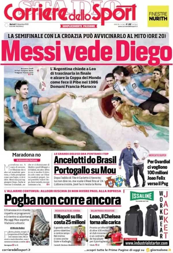 "Messi vede Diego", titola l'edizione odierna del Corriere dello Sport. "La semifinale con la Croazia può avvicinarlo al mito". Spazio anche al calciomercato: "Napoli su Ilic costa 25 milioni".