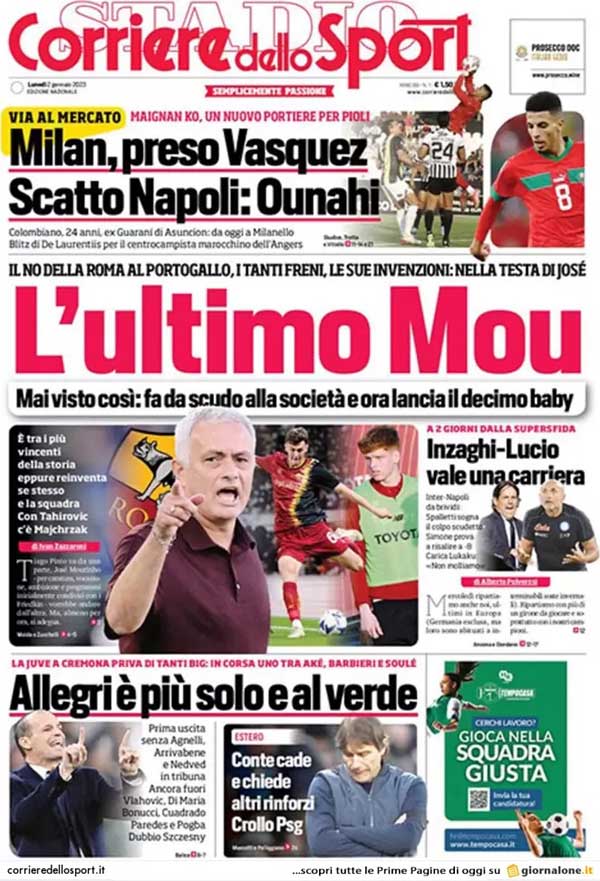 "Milan, preso Vazquez. Scatto Napoli: Ounahi", titola l'edizione odierna del Corriere dello Sport in merito alle possibili mosse di calciomercato di Milan e Napoli. Spazio anche a Inter-Napoli: "Inzaghi-Lucio, vale una carriera".