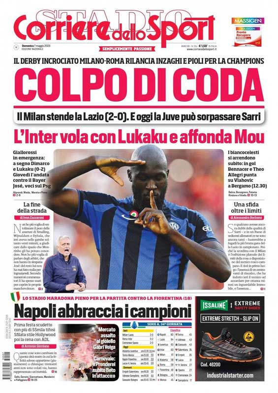 PRIMA PAGINA CORRIERE - Napoli abbraccia i campioni. L'Inter vola con Lukaku