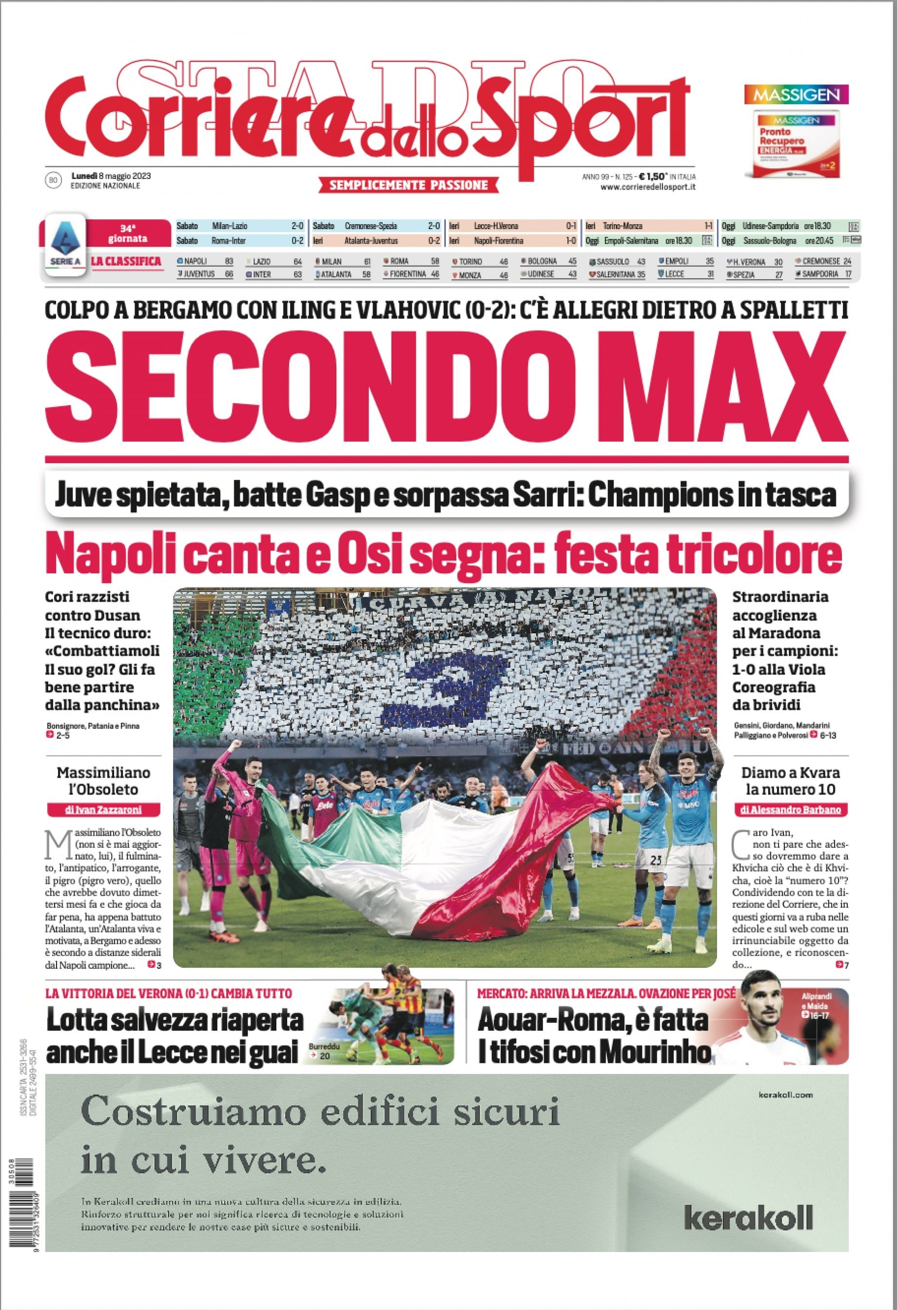 Sono tanti gli spunti che arrivano dalla prima pagina del Corriere dello Sport. Il noto quotidiano si sofferma su alcuni degli argomenti più caldi del momento. Ecco alcuni titoli dell'ultima edizione: "Napoli canta e Osi segna: festa tricolore. Juve spietata, batte Gasp e sorpassa Sarri: Champions in tasca".