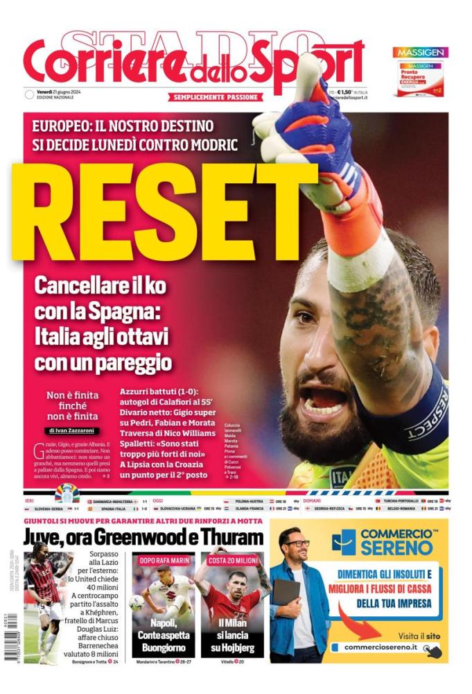 Sono tanti gli spunti che arrivano dalla prima pagina del Corriere dello Sport. Il noto quotidiano si sofferma su alcuni degli argomenti più caldi del momento. Ecco alcuni titoli dell'ultima edizione: "Reset. Cancellare il K.O. con la Spagna: Italia agli ottavi con un pareggio". Sul mercato: "Napoli, Conte aspetta Buongiorno. Juve, ora Greenwood e Thuram" si legge sul giornale.