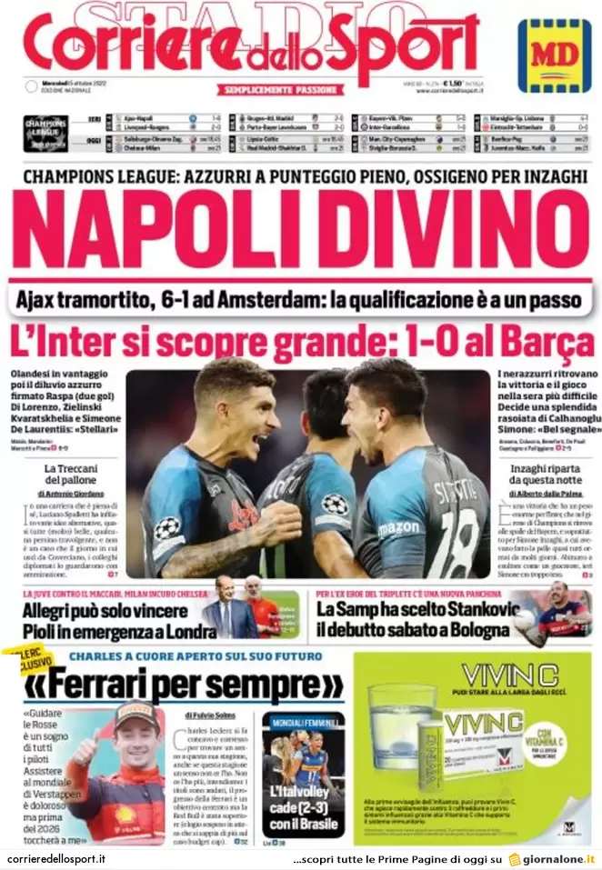 PRIMA PAGINA CORRIERE - Napoli divino. Ajax tramortito