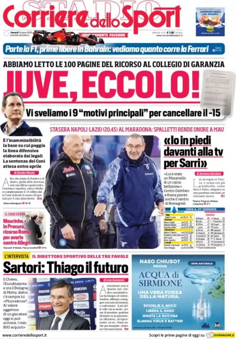 PRIMA PAGINA CORRIERE - Napoli-Lazio al Maradona: Spalletti rende onore a Mau